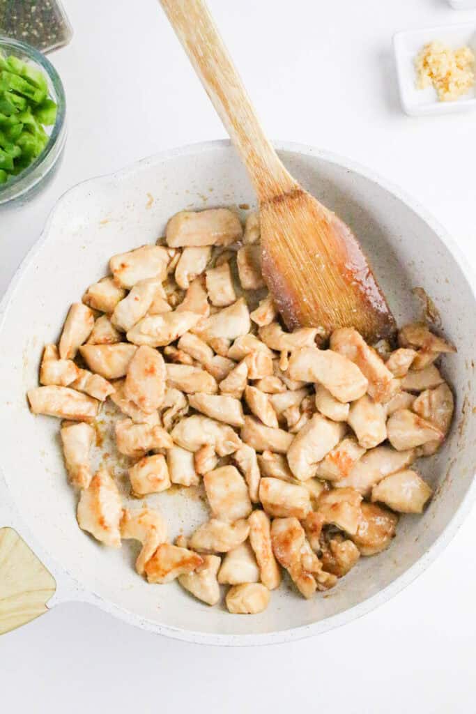 While the chicken is cooking, stir occasionally so each piece cooks evenly. Continue cooking until the internal temperature reaches 165°F and the chicken is completely cooked.