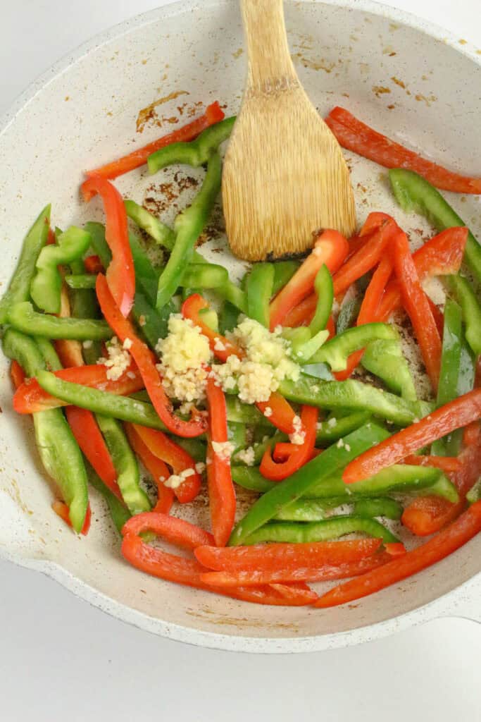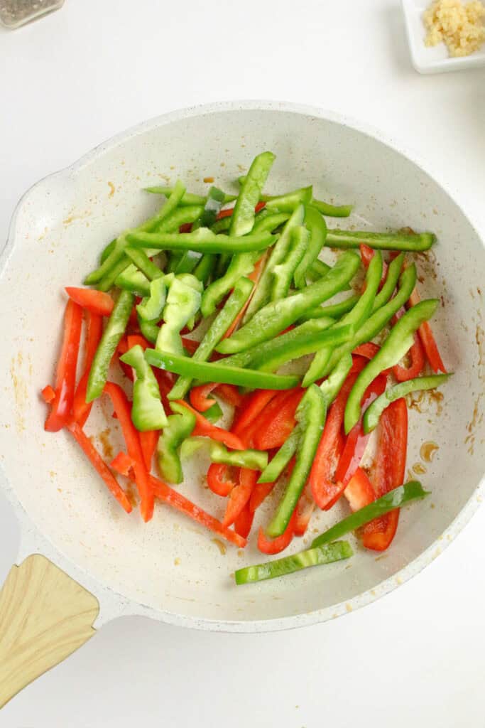 - In the same pan, add the sliced red and green bell peppers. Stir-fry for 2 to 3 minutes until slightly tender but still crisp. Add the garlic and ginger and cook for about 30 seconds until fragrant.