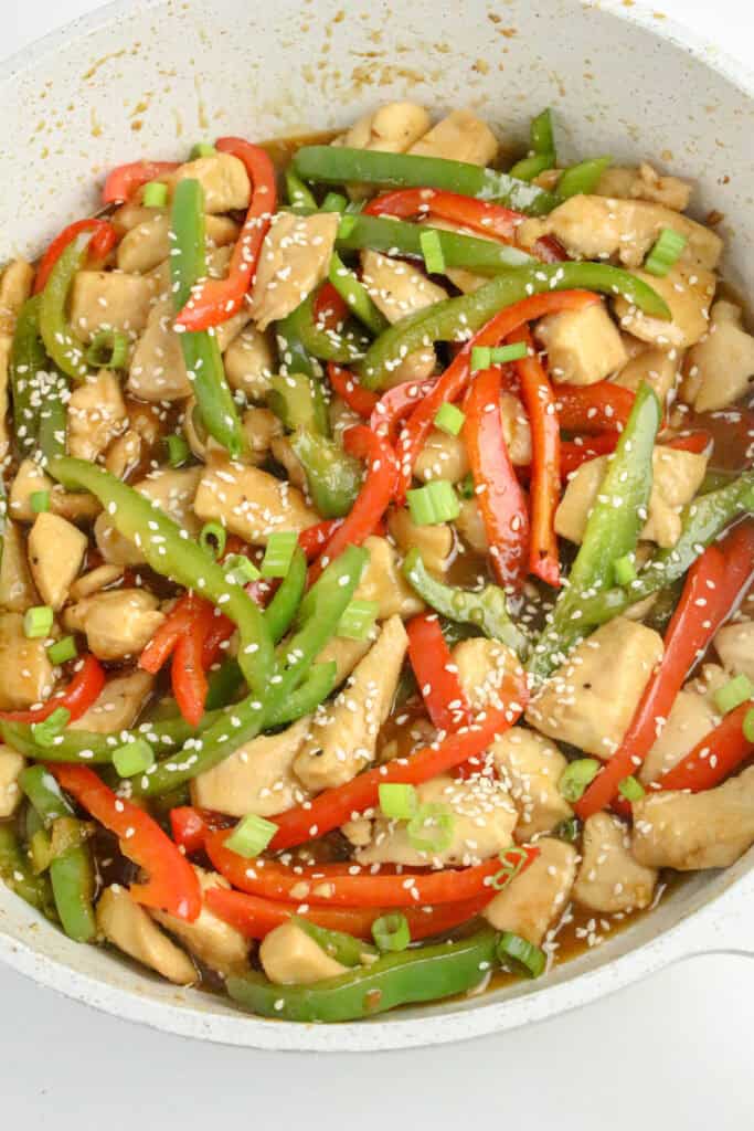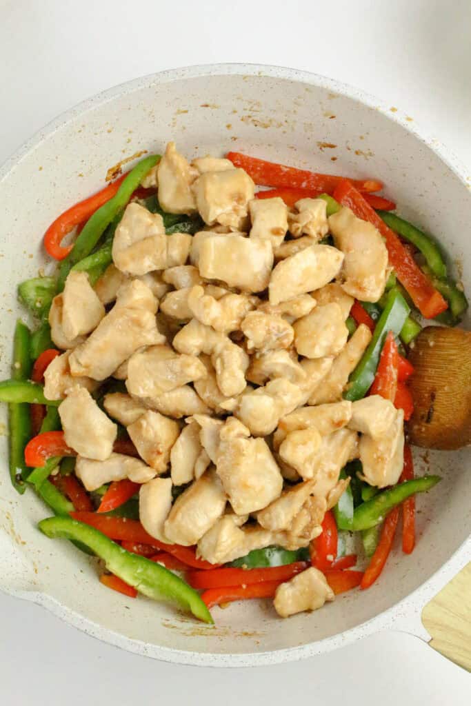 - Return the chicken to the pan. Pour in the honey pepper sauce and stir to coat the chicken and peppers.