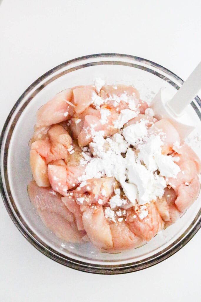 - In a medium bowl, toss the chicken pieces with 1 Tablespoon soy sauce and 1 Tablespoon cornstarch. Let the mixture sit while you prepare the vegetables and sauce.