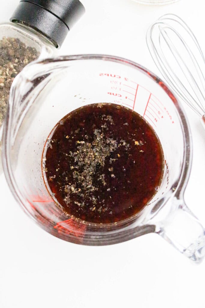 Next, whisk the sauce ingredients in a bowl: honey, soy sauce, vinegar, and pepper.